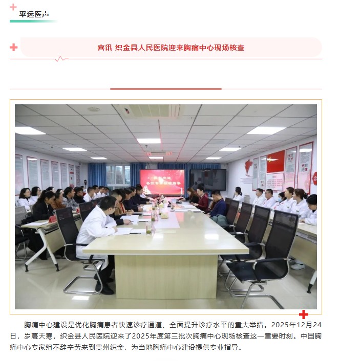 平远医声丨喜讯 织金县人民医院迎来胸痛中心现场核查 发布时间:2026-01-04 09:37 本文出处:Admin 平远医声丨喜讯 织金县人民医院迎来胸痛中心现场核查 宣传科 织金县人民医院 2025年12月26日 18:02 贵州
